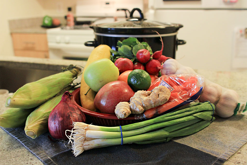 Feeling like I was entering a speak-easy, I eased through two narrow doors that were dripping from leaks.  Hidden inside is a beautiful market that looks much like a smaller version of the Farmers market in Dallas.  But the prices, well, they were unbelievable.  Radishes, two large squash, a bag of baby carrots, two apples – Golden Delicious and Fuji, two oranges, a bunch of green onions, a red onion, one lime, three ears of fresh corn, 5 garlic, and a ginger root all for under $10.  And to think… my girls say I am not a shopper!